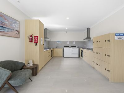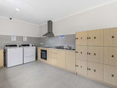 area, where you can cook up a storm and share laughs over dinner with friends, as well as a shared lounge and coin-operated laundry.