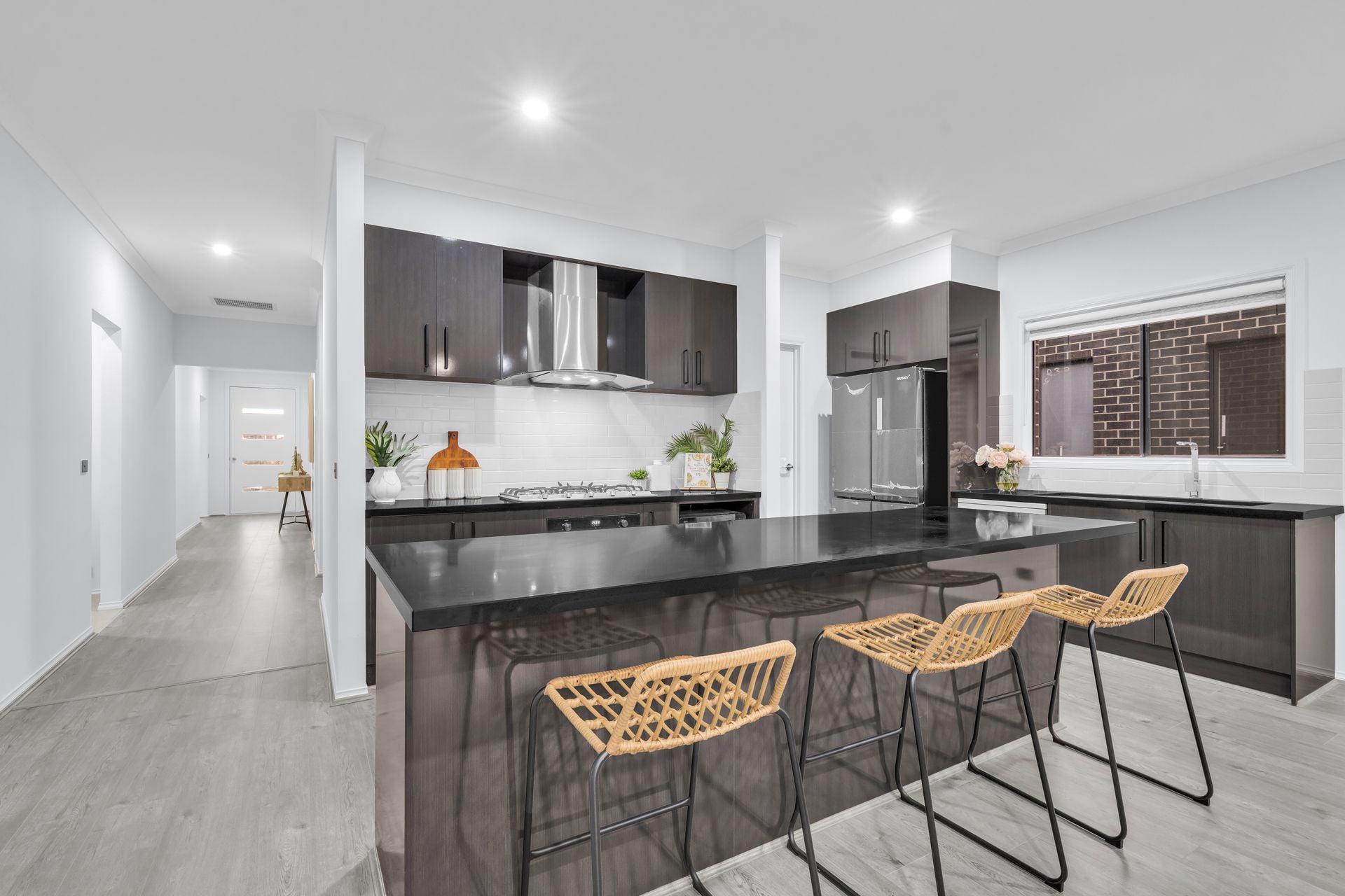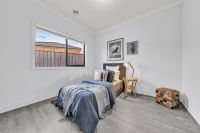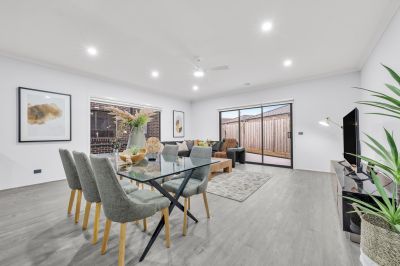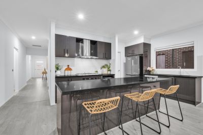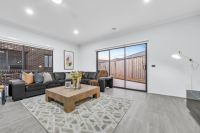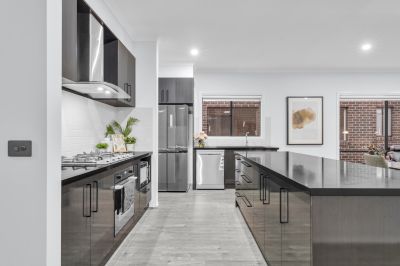 A contemporary showstopper, the kitchen bristles with glossy cabinetry, stainless-steel appliances, including a 900mm upright gas cooker, rangehood and dishwasher. Not to forget the walk-in-pantry, wide fridge cavity and stone benchtop. The dining and living areas are surrounded by windows, allowing abundant light to infiltrate the home.