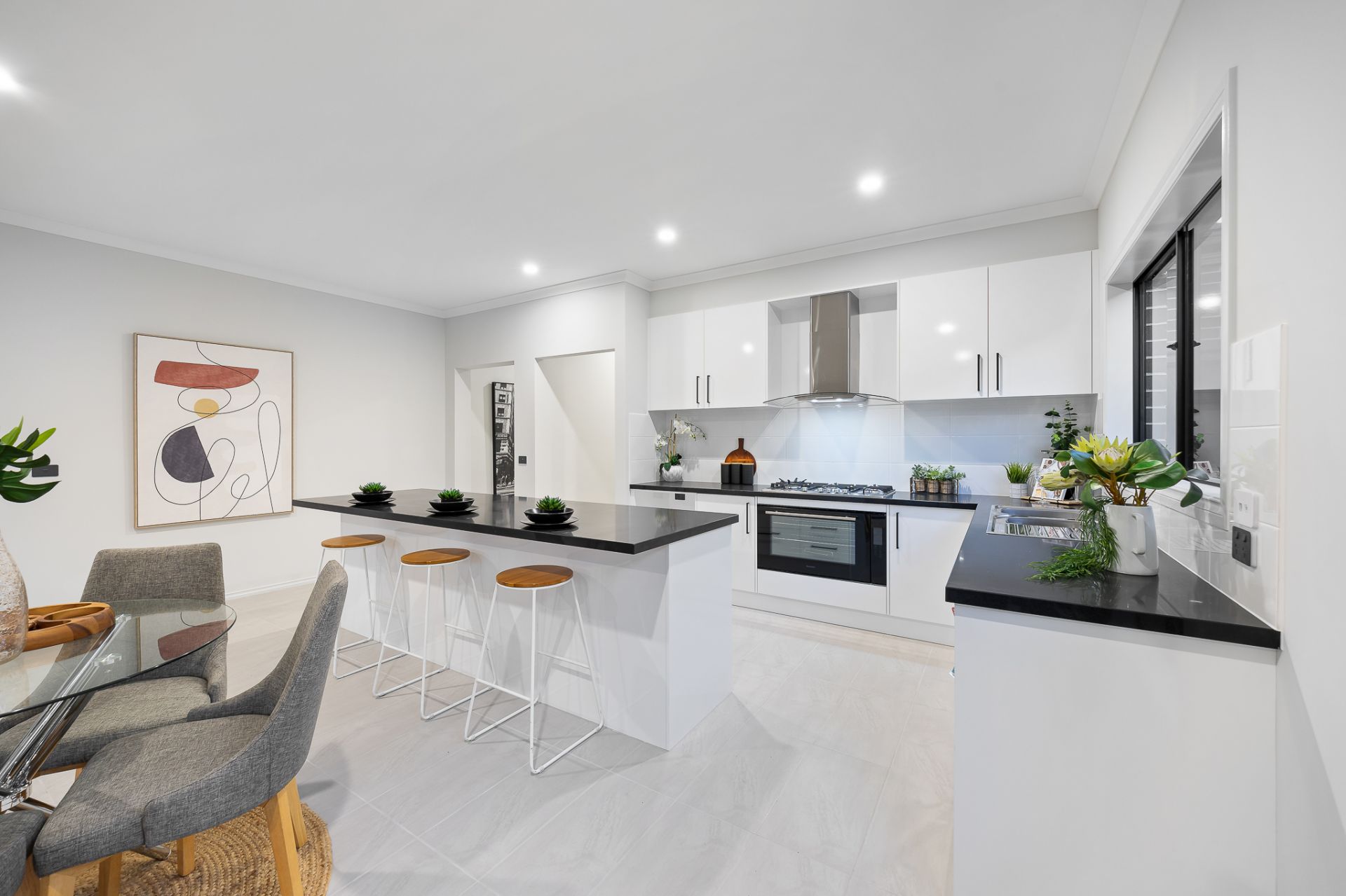 The open-plan kitchen boasts ample storage space, while the dining area overlooks the outdoor space. This display-quality kitchen features stainless steel appliances, stone benchtops, plenty of cupboards, and pot drawers, seamlessly blending sophistication and practicality.
