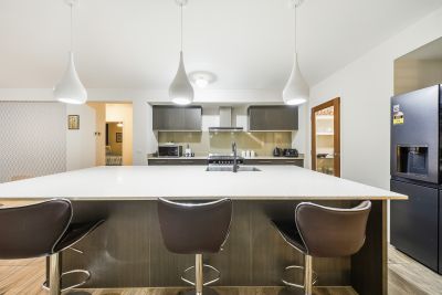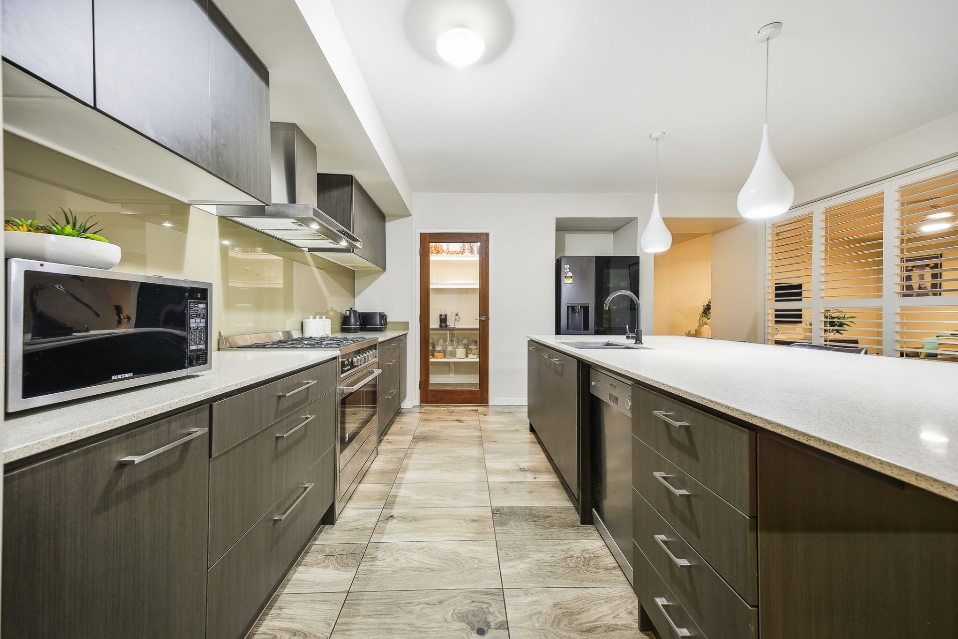 The showpiece kitchen features a 900 mm cooktop, rangehood, stone benchtops, tiled splashback, and an abundance of drawers and overhead cupboards. A full butler's pantry offers additional storage and preparation space, ensuring the kitchen remains both functional and stylish.