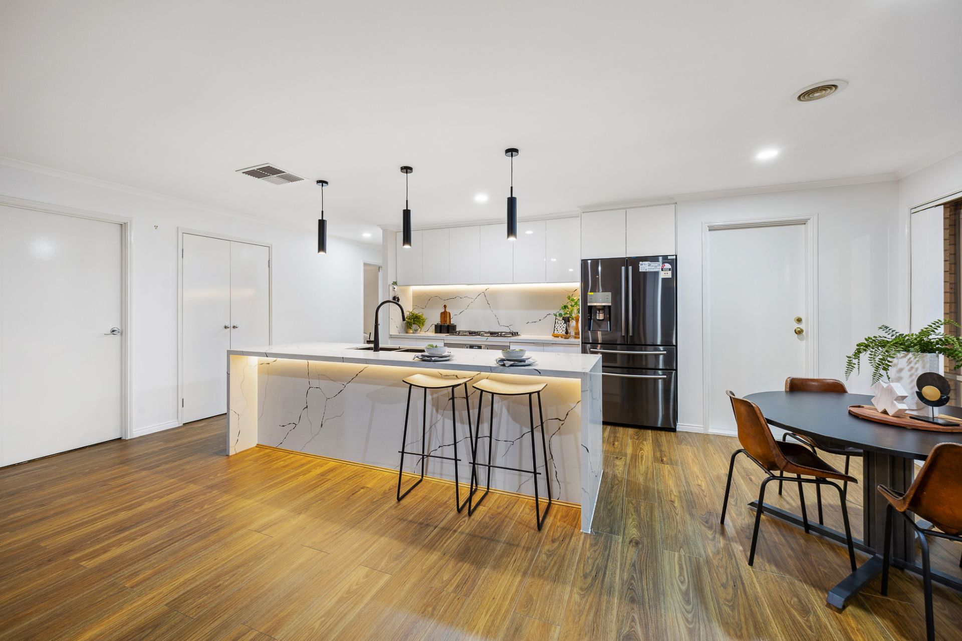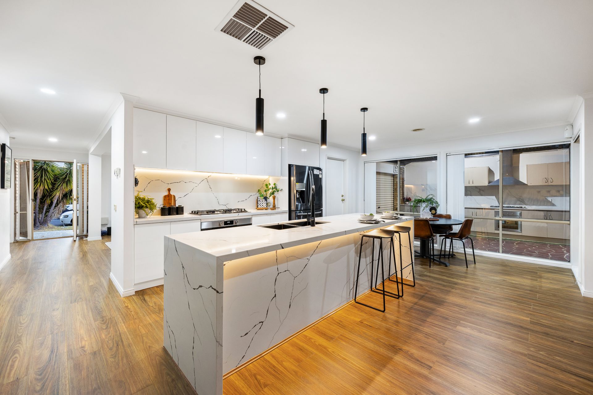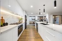 As you step inside, you'll immediately appreciate the expansive living areas and seamless flow between spaces. With five bedrooms and three distinct living zones, this home offers plenty of room for the whole family. At the heart of the home, the gourmet kitchen is a standout feature, complete with a 40mm waterfall stone island bench, gas cooktop, oven, dishwasher, and an abundance of bench and storage space. The kitchen overlooks the spacious meals and family area, ensuring effortless interaction between the spaces.