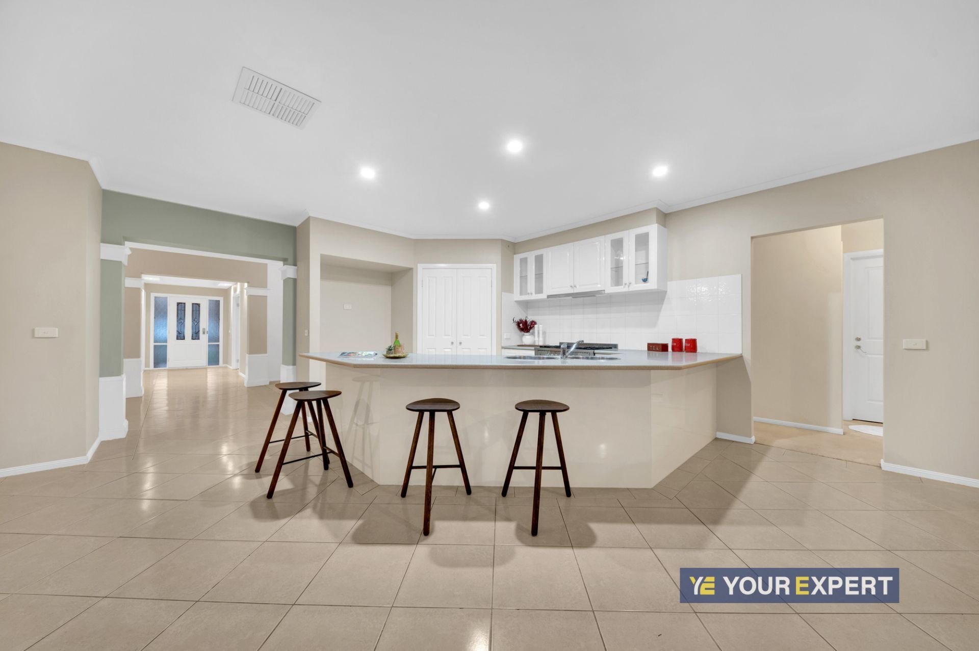 The heart of the home features a contemporary kitchen equipped with high-quality appliances, ample storage, and a large island bench, perfect for casual meals and social gatherings.